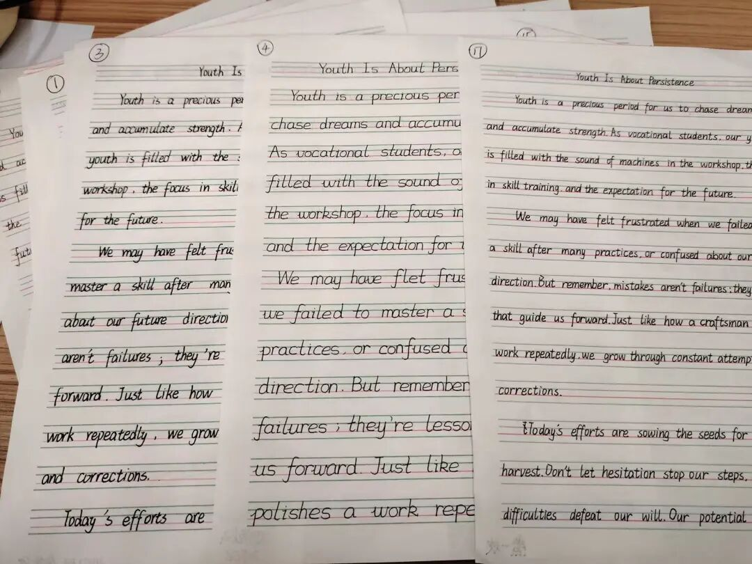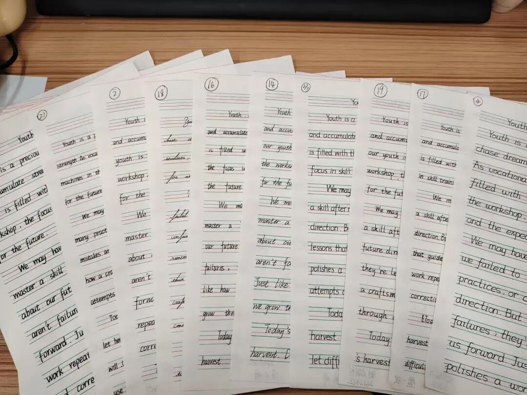 本次比赛自12月初启动班级预赛,高二年级各班学生积极参与,提交了大量切合主题、书写用心的初赛作品。英语组教师对所有班级提交的作品进行了认真评审,从书写规范、卷面整洁、内容切题等多方面综合考量,遴选出一批优秀作品,其作者成功晋级校级决赛。 英语书法比赛预赛 12月中旬,决赛现场安静而专注。进入决赛的同学们齐聚一堂,在规定时间内,围绕给定内容进行现场书写。一时间,只闻笔尖划过纸张的沙沙声。他们或凝神构思布局,或专注勾勒字母,横平竖直,圆润饱满,力求在有限的卷面上展现最佳的书写风采。 比赛秉持公平、公正、公开的原则。英语组老师进行现场监考,确保比赛秩序井然。书写环节结束后,评委老师立即对作品进行当场评审与打分。评委们从书写规范性、卷面整洁度、整体美观度及创意表现等多个维度细致评阅,每一份作品都经过认真审视。 优秀作品展示 此次英语书法比赛不仅是一次技能的较量,更是一次美的熏陶与文化的浸润。同学们以笔为媒,以纸为径,在英文书写中感悟语言之美,在字里行间书写属于自己的青春篇章。 多彩校园,梦想正从这里起航。让我们共同期待更多优秀作品的诞生,见证笔尖绽放的熠熠光彩!